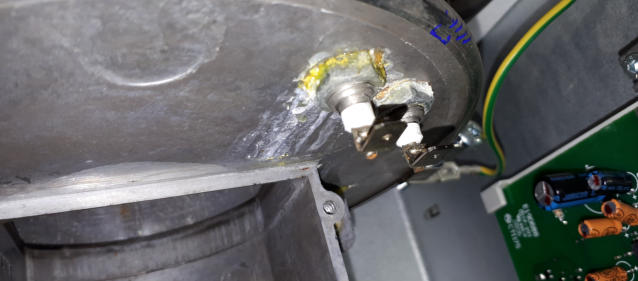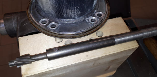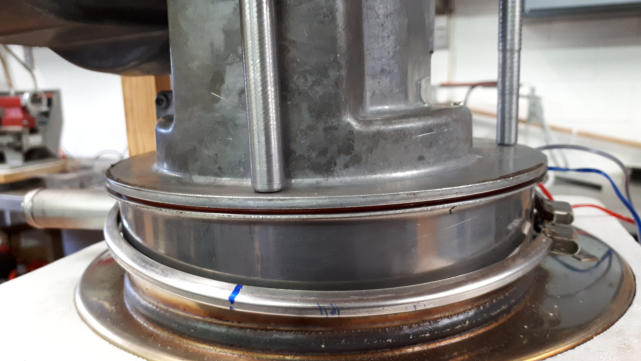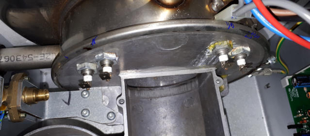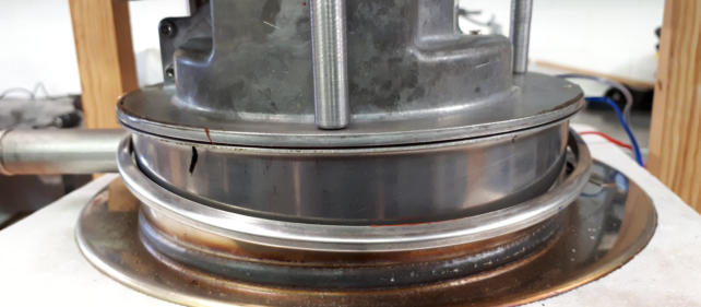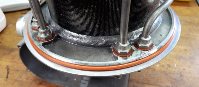 Hier sind die Verschraubungen der Heizstäbe undicht geworden. Der Kessel musste dazu ausgebaut und zerlegt werden. Die Ursache der Undichtigkeiten wäre mit dem Wechsel der Dichtungen allein jedoch nicht behoben. Nun musste zunächst ein Fräser hergestellt werden, und darauf noch eine Montagehilfe/Presse um den Kessel wieder mit neuem O-Ring zu verschließen.