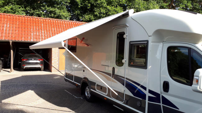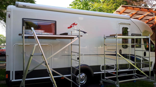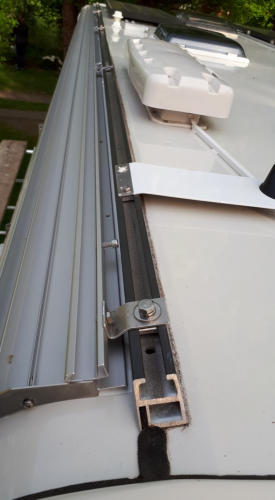 Mit den von mir gefertigten Haltern konnte die Markisen-grundplatte ohne Löcher durch die Aussenhaut befestigt werden. Der Halt wird durch die übliche Verklebung zwischenPlatte und Aussenhaut gewährleistet. Hier habe ich dieDachhaut vor der Verklebung auch noch foliert. Die Verklebung erfolgte nur umlaufend. Eine künftige Demontage der Platte wäre so möglich.