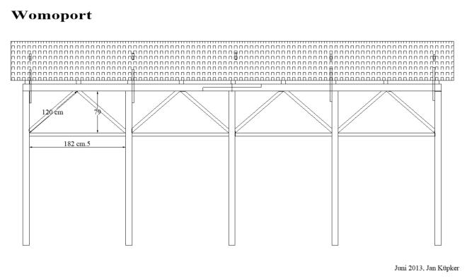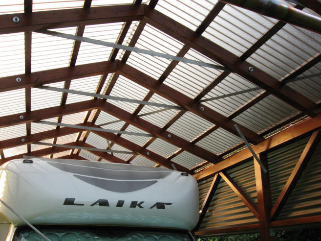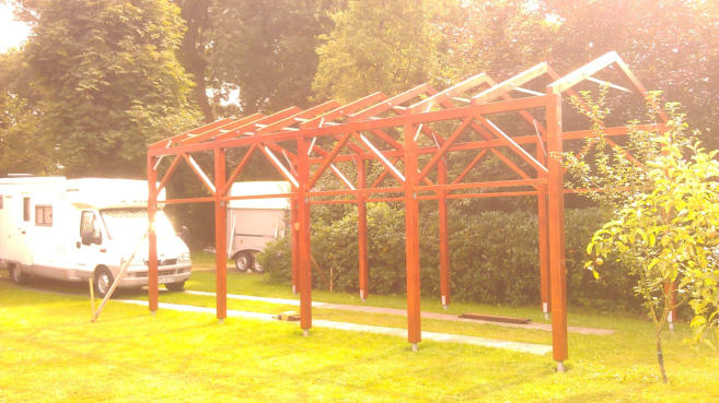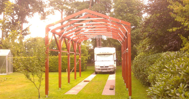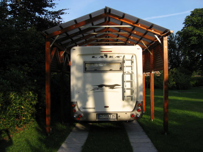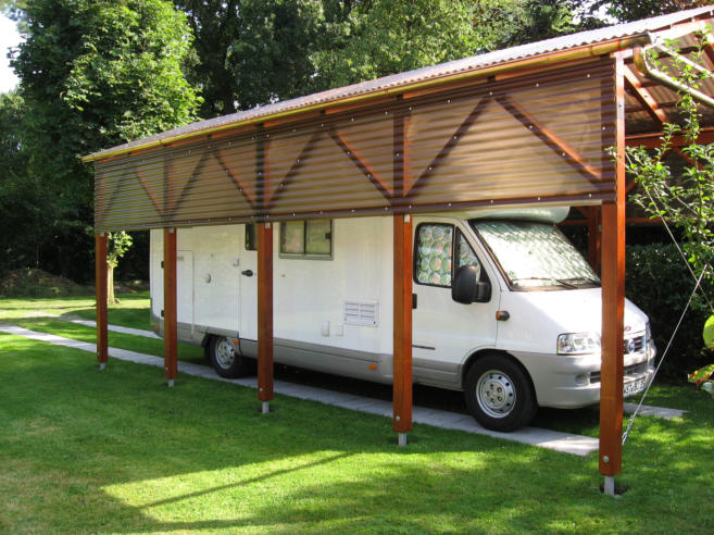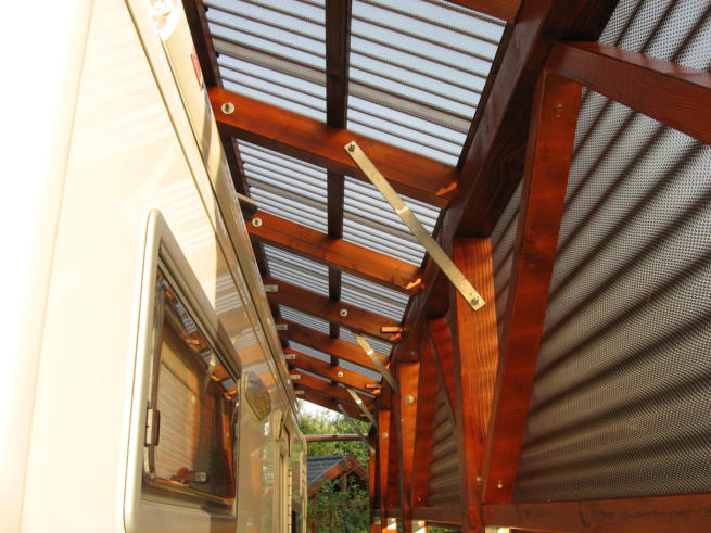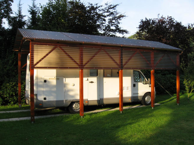Diesen Wohnmobil- Carport plante und baute ich 2013. Er ist wie ein Bausatz von mir vorgefertigt worden.Der Aufbau erfolgte auf zuvor exakt positionierte Stüten. Die Dach- u. Seiteneinkleidung erfolgte mit getönten Acryglasplatten. Die PV-Anlage des Wohnmobils erhält so noch genügend Licht zum ladender Akkus während der Standzeiten.